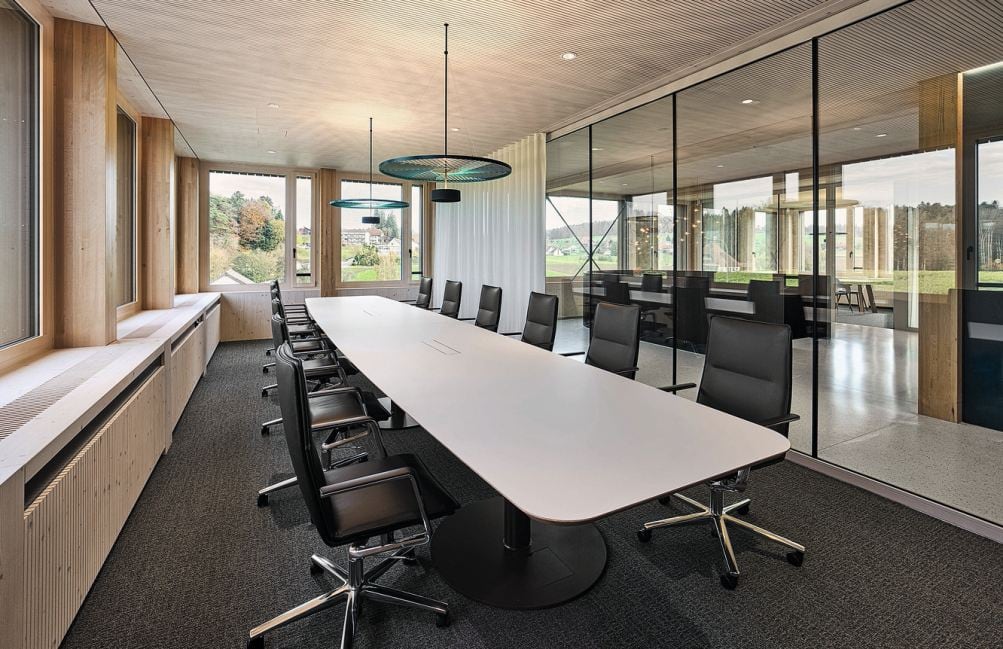 Kundenanlässe und Events können im multifunktionalen, polyvalent einsetzbaren Dachraum, unabhängig voneinander, stattfinden – mit einzigartigem Aus- und Weitblick in und über den Bucheggberg hinweg. Eine Dachterrasse ergänzt den halböffentlichen, erdgeschossigen Aussenraum und bietet Rückzug und Aufenthalt für die Mitarbeitenden.