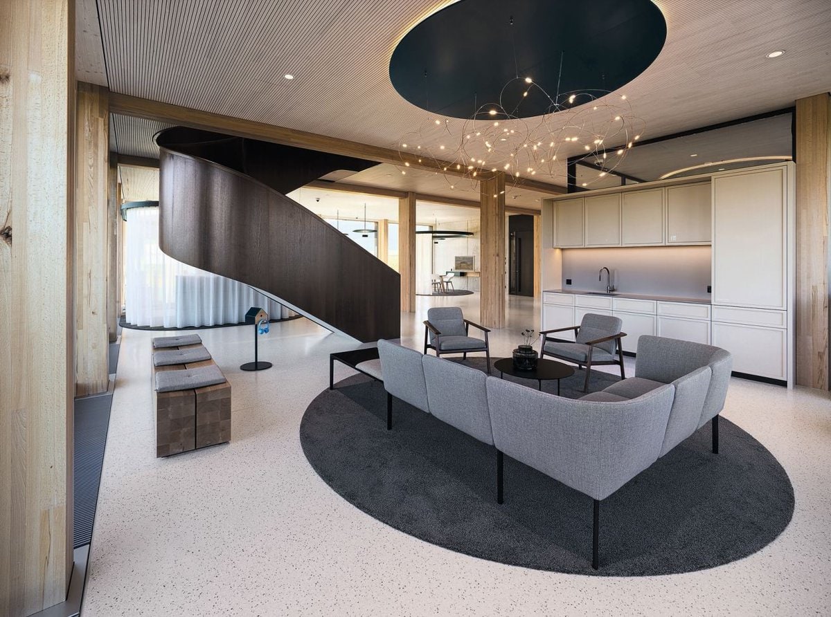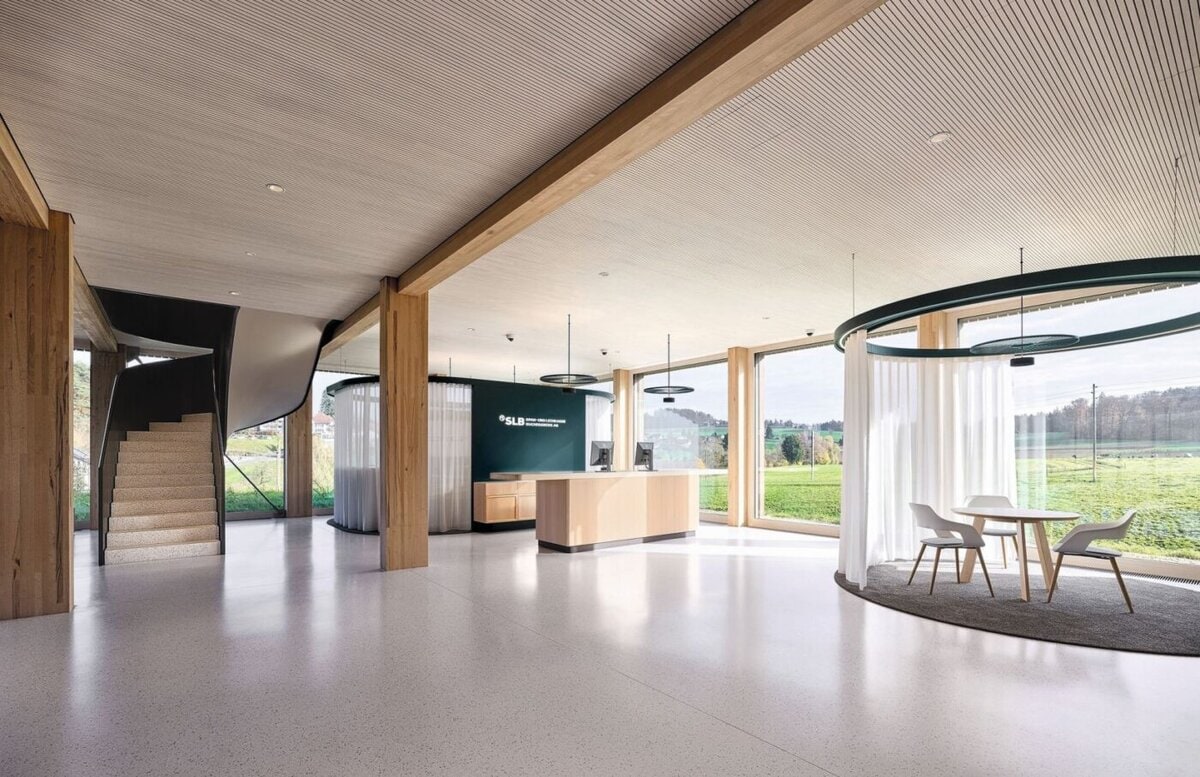 Die Kundenhalle organisiert differenziert zonierte Bereiche und ist dreiseitig raumhoch verglast, um für die Kundschaft immer wieder die umliegende Landschaft einzufangen. Die persönliche Kundenbedienung erfolgt an den südlich platzierten Desks. Für vertrauliche Besprechungen sind die entsprechenden Beratungszimmer im Obergeschoss via hölzerne Treppe, die wie eine Skulptur im Raum steht, oder via Aufzug erreichbar.