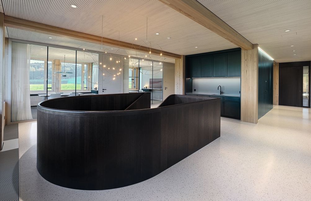 Viereinhalb Jahre dauerte die von SSM Architekten AG durchgeführte Planung. Von Anfang an leitete die zentrale Prämisse den Entwurf – aufzunehmen und neu zu interpretieren, was an gewachsenen Strukturen und historischen Gegebenheiten den Landschaftsraum prägen. Eine bäuerliche Kulturlandschaft mit den Dörfern, Waldsäumen ebenso als auch die markanten «Weilergruppen» mit Bauernhaus, Scheune und Stöckli. Diese Gegebenheiten adaptiert der Holzbau; er bietet allseitig den verschiedenen Bereichen und Sequenzen Sicht in diese natürliche oder gebaute Umgebung und umgekehrt spiegelt er diese.