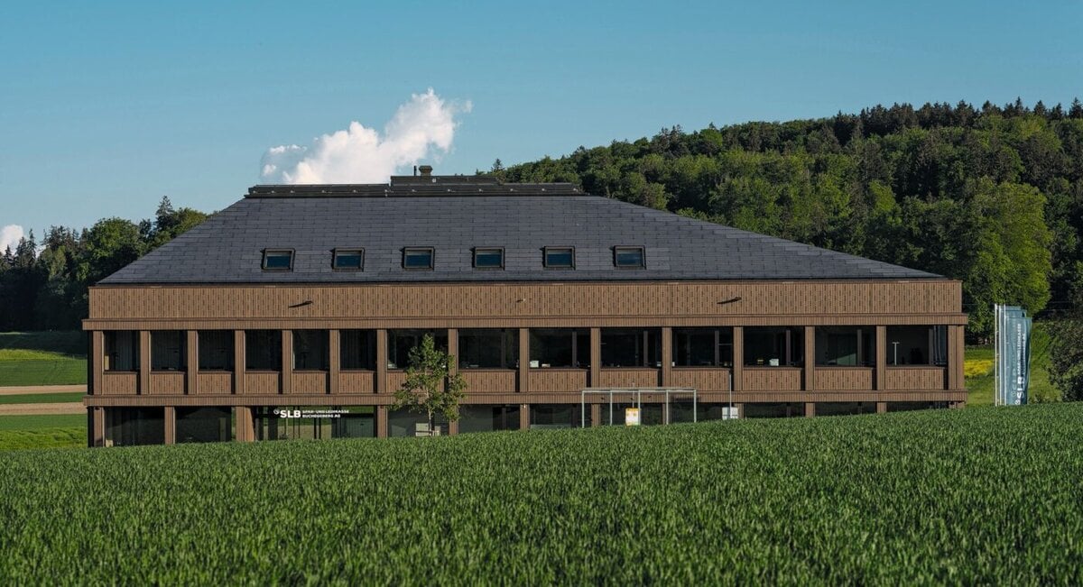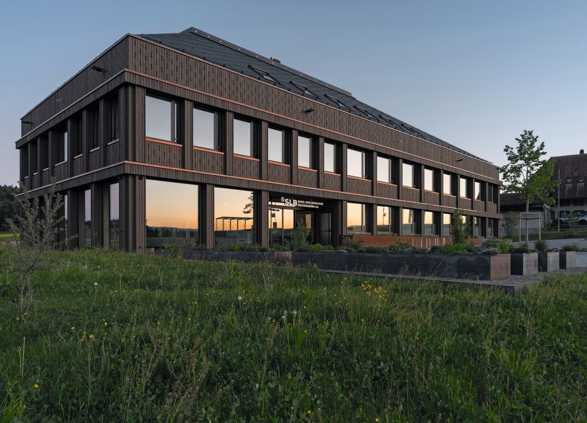 Beim Fahren durch die hügelige Landschaft des Bucheggbergs – gern auch «Buechibärg» genannt – begegnet einem die Schönheit einer der letzten naturnahen Kulturlandschaften. Gepflegte Dörfer, bewaldete Hügel, saftige Wiesen, farbenprächtige Felder. In diese Bilderbuch-Idylle passen auch die grossen Bauernhäuser mit Walmdach. Sie fallen auf und prägen das Landschaftsbild mit. Diese referenziert der Neubau für eine Bank nun in moderner Gestalt, der heutigen Zeit angemessen.