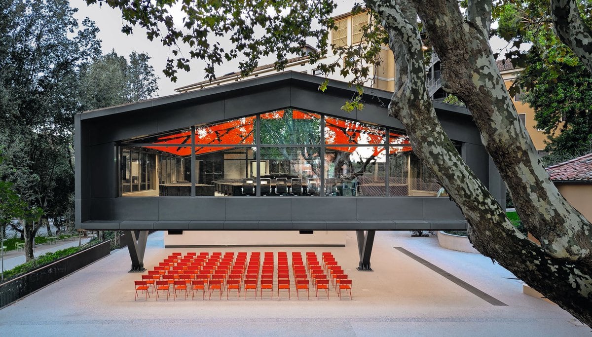 Die abgehängten Akustikpaneele bilden die Zwischendecke des Amphitheaters und ziehen mit ihrer korallenroten Farbe die Aufmerksamkeit von aussen auf sich, während ihre organische Silhouette den Dialog mit dem angrenzenden Hain verstärkt. Dieses auffällige Rot kennzeichnet auch das Mobiliar und einige Elemente der Unterrichtsräume. Es ist ein raffiniertes Detail, das dem gesamten Komplex eine grosse visuelle Kohärenz verleiht, insbesondere wenn das Gebäude am frühen Abend zum Leben erwacht. Die Aussenbereiche wurden mit Kiesbelag neu gestaltet. Ein durch den Schatten einer Reihe von Steineichen geschützter Terrassenweg verbindet hingegen den Hainbereich mit dem Platz. Alle Aussenbereiche wurden so gestaltet, dass sie zum Lernen, zu informellen Treffen, zur Entspannung und zum Spielen einladen. Sie bieten zahlreiche Möglichkeiten der Zusammenkunft und eine grosse Nutzungsflexibilität. Das Projekt von Alvisi Kirimoto ähnelt einem riesigen Teleskop, das über das Grün hinausragt und über den Platz darunter wacht. Es wird damit zum neuen Mittelpunkt auf dem Universitätscampus. ●