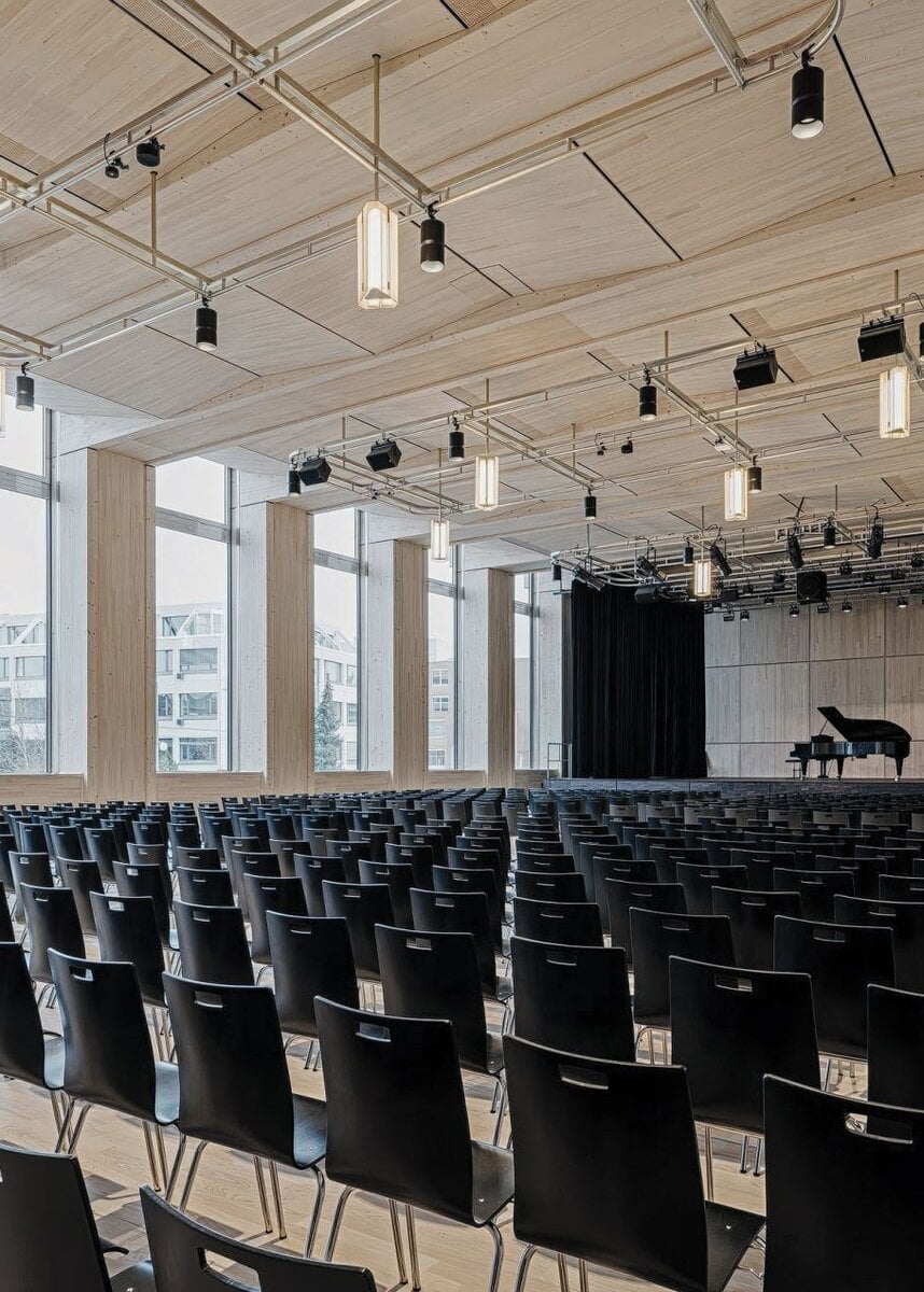 Die Neubauten stammen von Penzis Bettini Architekten aus Zürich, das 2017 den offenen Wettbewerb gewann. Die Rohbau-Ästhetik und die offene Führung der Leitungen, die in den bestehenden Gebäuden charakteristisch sind, führten sie in den Neubauten weiter. Die einfache Gebäudestruktur erlaubt es, die Raumaufteilung der Schulzimmer bei Bedarf flexibel anzupassen. Dies entspricht auch den Bedürfnissen der gymnasialen Bildung, die in Zukunft noch stärker interdisziplinär erfolgen soll.