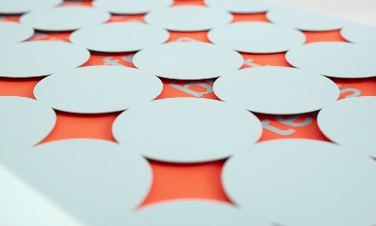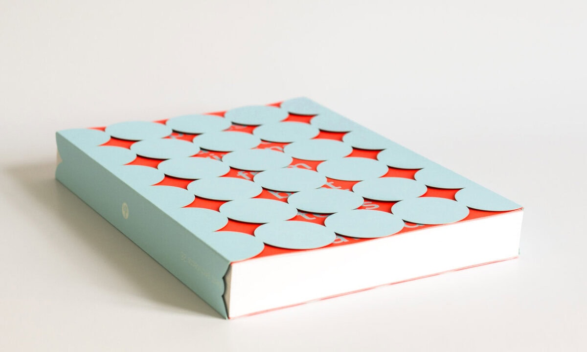 Das Buch wird von einer Banderole aus grossen Kreisen umhüllt. Die dazwischen entstehenden Öffnungen geben subtile Durchblicke auf den fluoreszierend roten Leineneinband frei. Dadurch entsteht ein spannendes Spiel aus Material, Farbe und Form, das dem Cover eine besondere Tiefe verleiht. Ein hellblauer Siebdruck liegt auf der leuchtend roten Leinenoberfläche und erzeugt einen feinen Flimmer-Effekt.