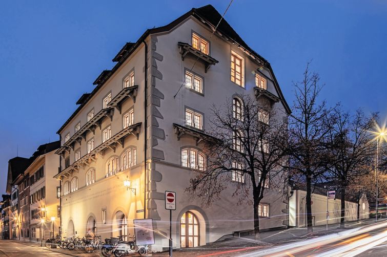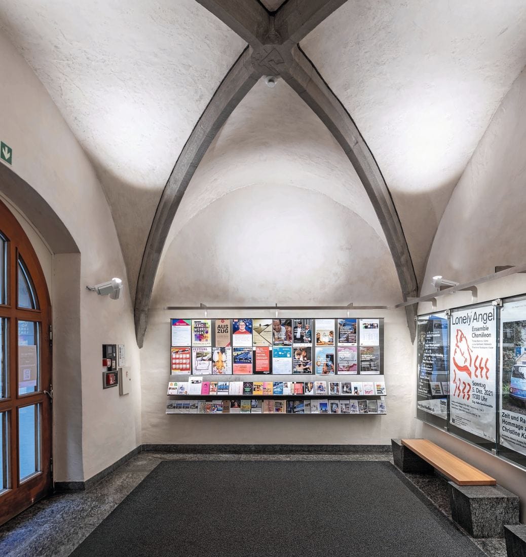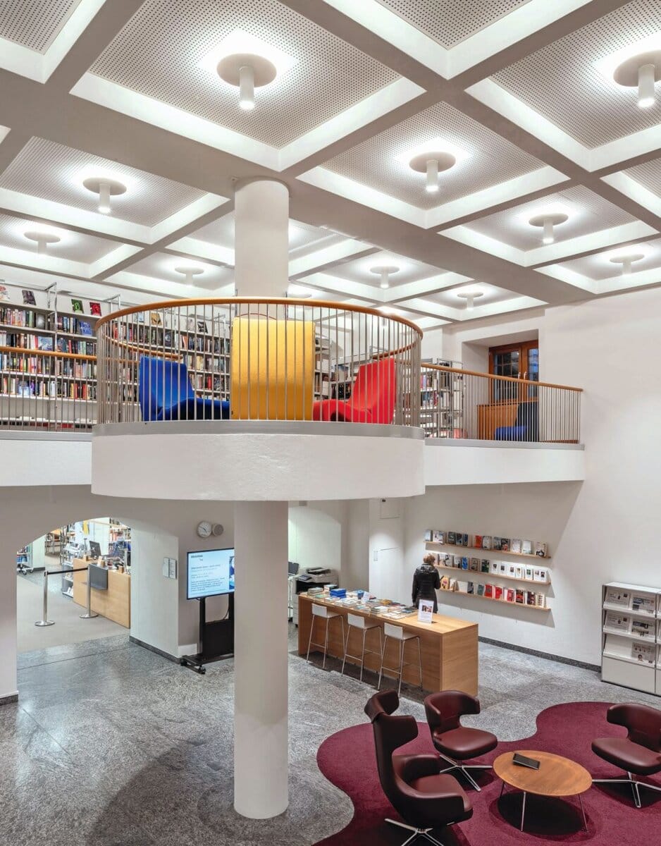 Bleiben wir beim Innenlicht. Die gezeigten Beispiele illustrieren nur einige der vielen Möglichkeiten, das richtige Kunstlicht in den Raum zu bringen. Die Bibliothek Zug ist ein Ensemble von zwei unterschiedlichen Gebäuden. Der Haupteingang, die Eingangshalle und die Verwaltung befinden sich im ehemaligen Kornhaus. Der Bau aus den 1980er Jahren der Architektengemeinschaft Bernath, Frei und Krähenbühl weisst eine zeittypische postmoderne Architektursprache auf. In dieser Sprache sind auch die Glasleuchten-Bänder gestaltet. Sie prägen das Interieur und wurden leicht modifiziert belassen.