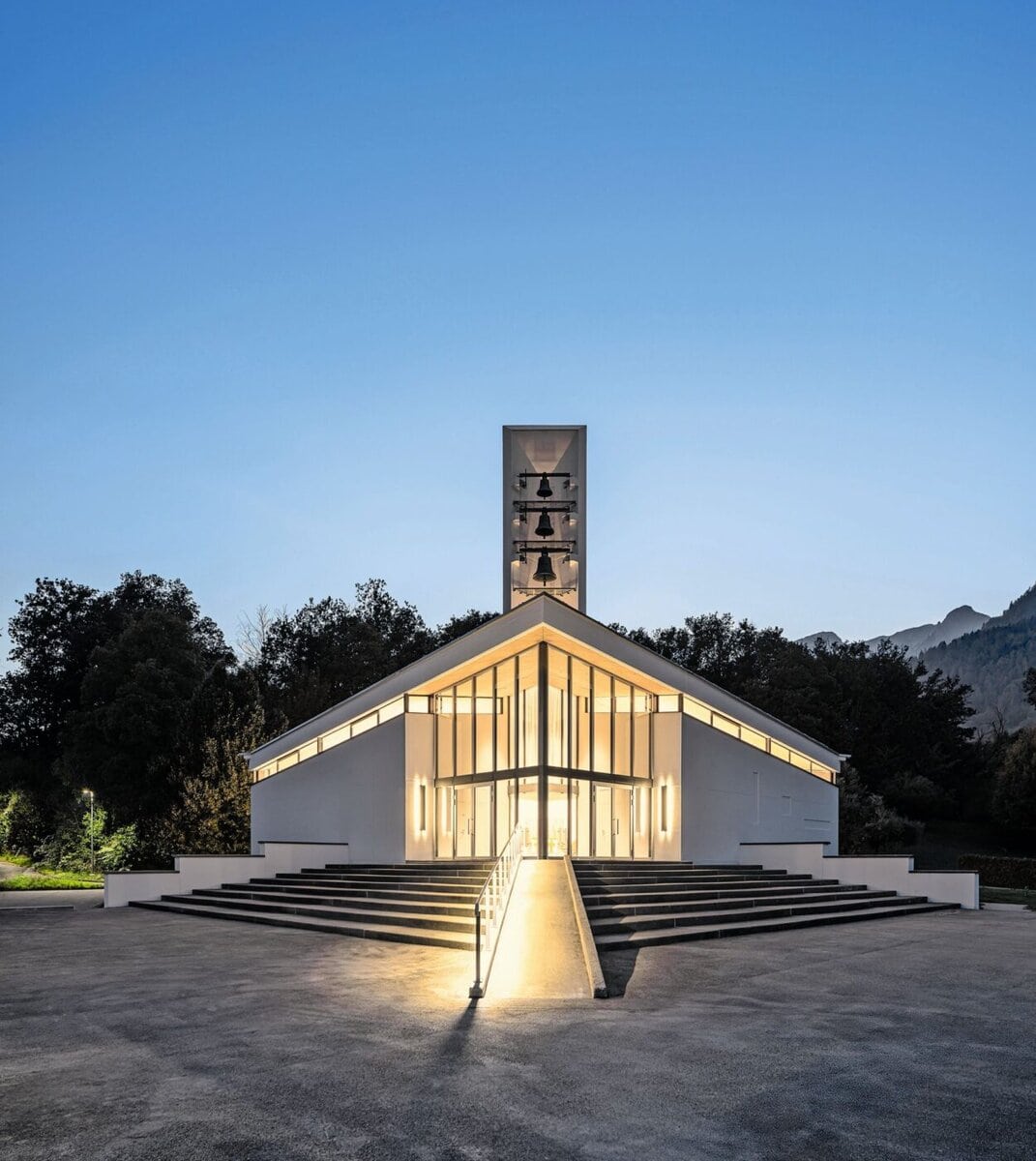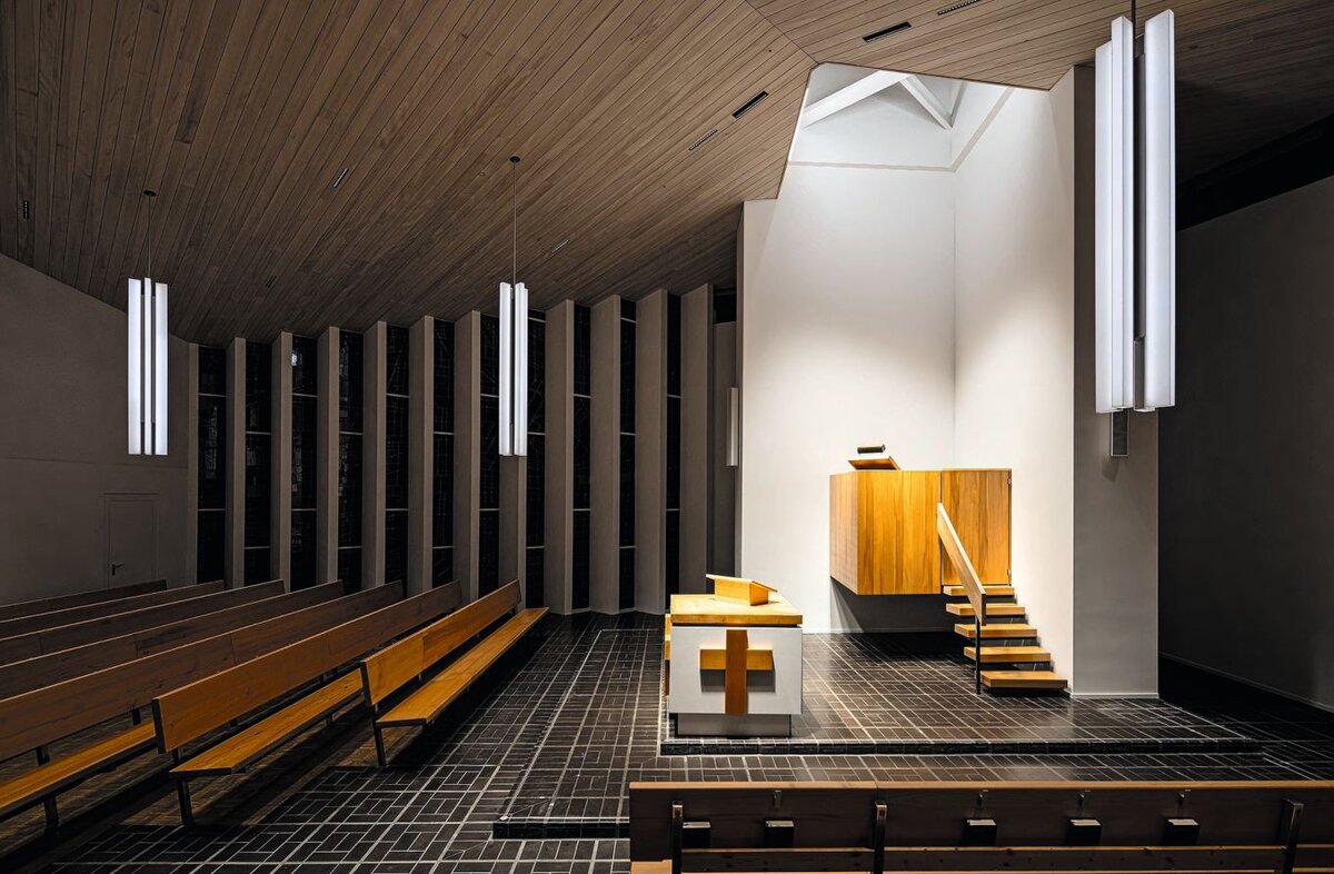 Die Evangelische Kirche Domat/Ems entstand zu Beginn der 1960er Jahre und ist ein Frühwerk des bekannten Churer Architekturbüros Domenig Architekten. Die Sanierung hielt sich an die Ideen des ursprünglichen Projekts und befreite den Bau von nachträglichen Veränderungen. Zur Erbauungszeit wurde die Kirche mit sechs kreuzförmigen Pendelleuchten beleuchtet, die im Laufe der Zeit ersetzt wurden. Die neue Lichtgestaltung nimmt die prägnante Form wieder auf und überführt diese in ein zeitgenössisches Design. Die Pendelleuchten werden mit linearen, in die Decke eingelassene Downlights ergänzt. Diffuses und direktes Licht ermöglicht neu verschiedene Lichtstimmungen. Kirchenbesuchende begegnen sich in leicht schattigem Licht, das die Gesichter natürlich wiedergibt. Bei Konfirmationen schmücken die Pendelleuchten den Raum. Während einer Andacht sorgen die Downlights für eine introvertierte Stimmung mit tiefem Lichtschwerpunkt. Ähnlich dem Tageslichteinfall fällt das künstliche Licht aus dem Oberlicht auf den Altarbereich und verleiht diesem eine unaufdringliche Präsenz.