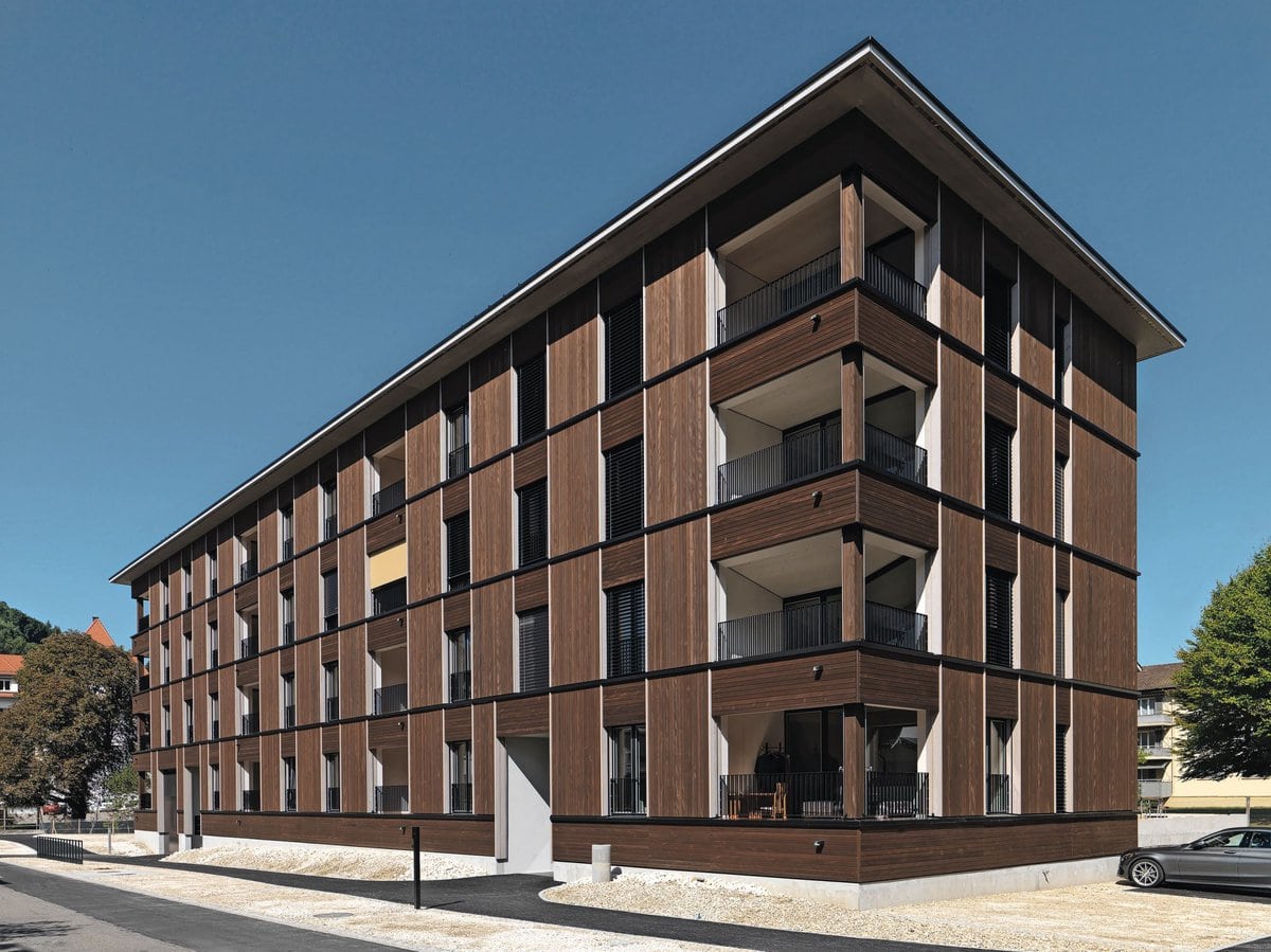 Im westlichen Teil des Gelterkinder Siedlungsgebietes, in unmittelbarer Nähe zum Bahnhof sowie in Fusswegdistanz zum Ortszentrum, hat das seit 1998 bestehende Architekturbüro Lehner + Tomaselli AG aus der Nachbarsgemeinde Sissach den Holzbau entwickelt. Ein Volumen, zwei Mehrfamilienhäuser. Die Büroprämisse – komplexe Bedingungen von Architektur zu einer plausiblen Gestalt zu verdichten – wurde hier vollends umgesetzt. Die besondere Herausforderung der Planung und Ausführung eines derart kompakten Holzelementbaus war auch für die Planenden eine neue und eindrückliche Erfahrung.