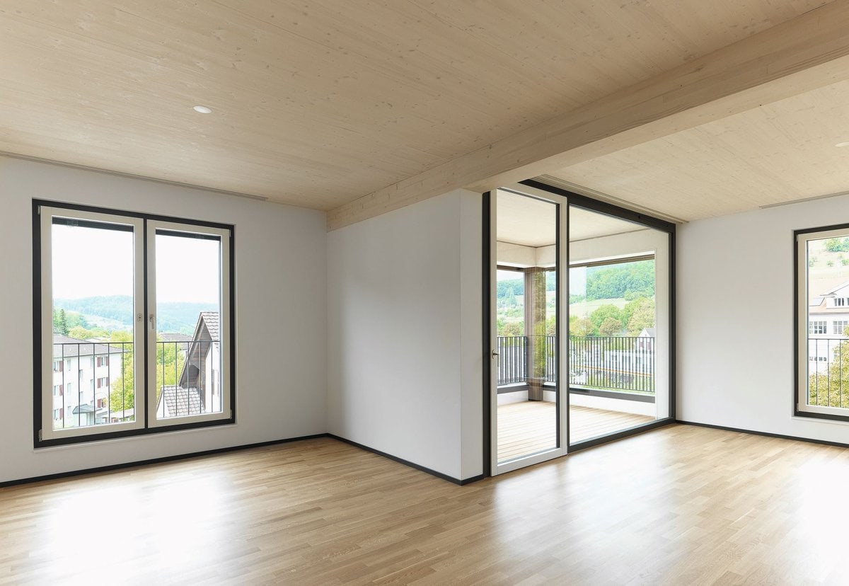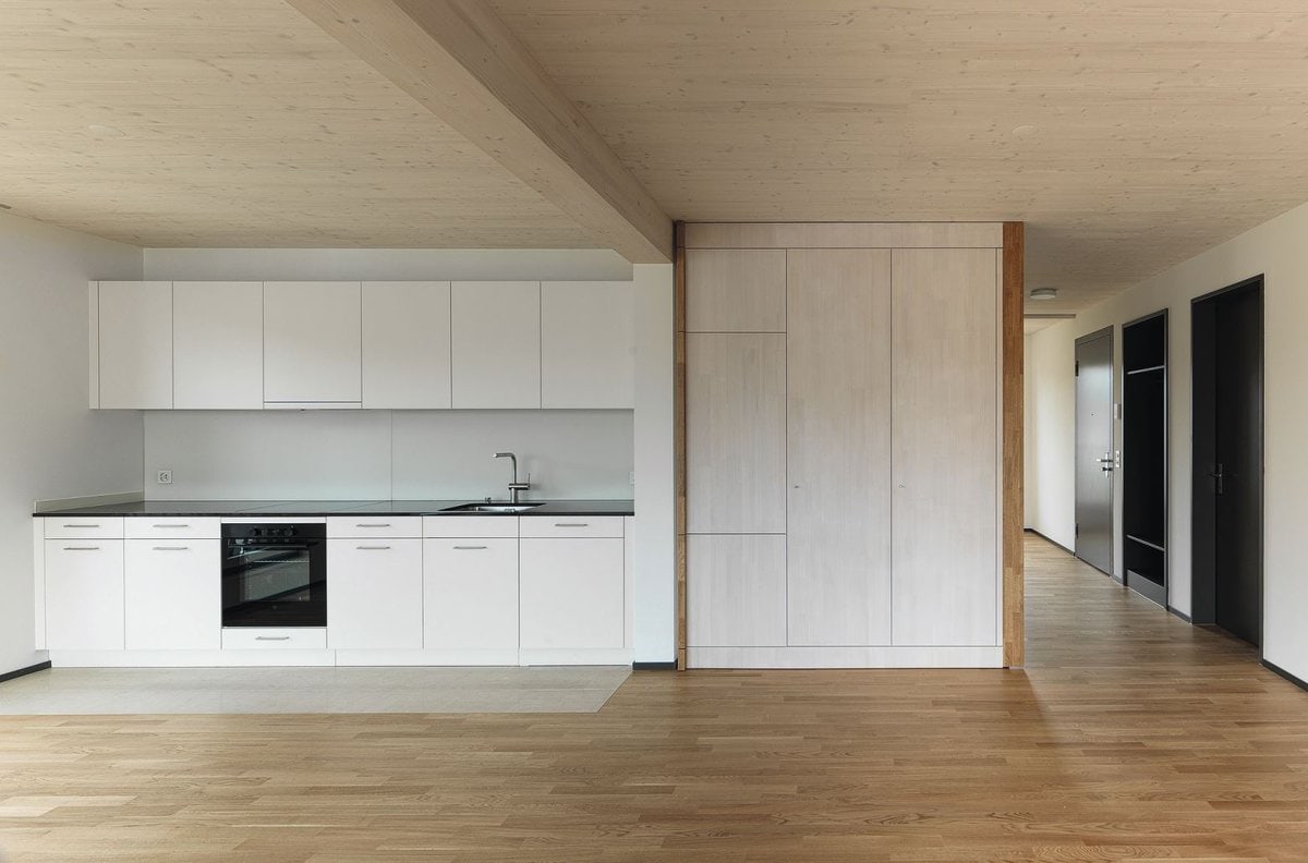 Die Grundrisse ermöglichen sowohl ost- wie auch westseitig Räume, die an die Fassade reichen und dadurch den ganzen Tag über besonnt sind. Genauso ermöglichen sie flexible Zuordnungen von Schlafzimmern respektive einen Ausbau der 2,5- und 3,5-Zimmer-Wohnungen. Alle Einheiten verfügen über ein grosszügiges Entrée mit Garderobe. Ostseitig zum Garten hin organisieren sie eine variabel nutzbare Vorzone mit einem als Einbaumöbel ausgebildeten Separat-WC wie auch Reduit. Das Badezimmer ist grosszügig geschnitten und bietet Platz für einen eigenen Wasch- und Trockenturm. Die Zimmer berücksichtigen viel Platz für Schränke. Die Holzelementdecken bleiben sichtbar, um den Holzbau auch im Innern erlebbar zu machen. Die Materialien im Innenausbau sind sorgfältig und konsequent mit Fokus auf die Nachhaltigkeit ausgewählt worden.