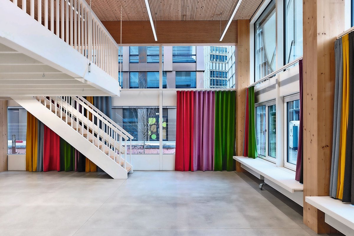 Für den Schulsport gibt es eine Sporthalle und einen Gymnastikraum. Auf dem Dach können der Allwetterplatz und der mit Pflanzinseln ausgestaltete Pausenraum ausserhalb der Schulzeiten bis 22 Uhr auch vom Quartier genutzt werden. «Aufgrund der sehr beschränkten Platzverhältnisse haben wir aus der Not eine Tugend gemacht», freut sich Schulvorsteher Filippo Leutenegger über die Stadtzürcher Pionierlösung und ergänzt: «Die Freiräume auf dem Dach laden zum Spielen oder Verweilen ein. Dass dabei am Boden mehr unversiegelte Grünfläche erhalten bleibt, ist ein zusätzlicher Gewinn für Schule, Quartier und Umwelt.»