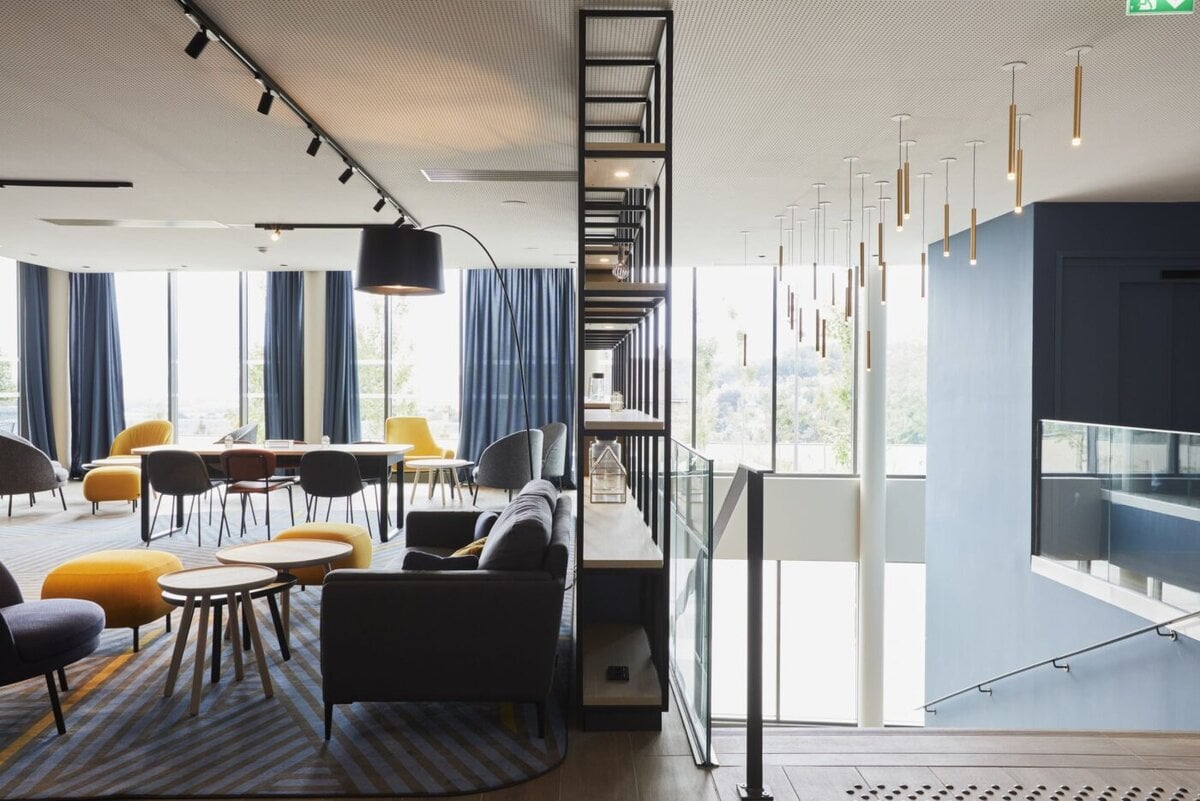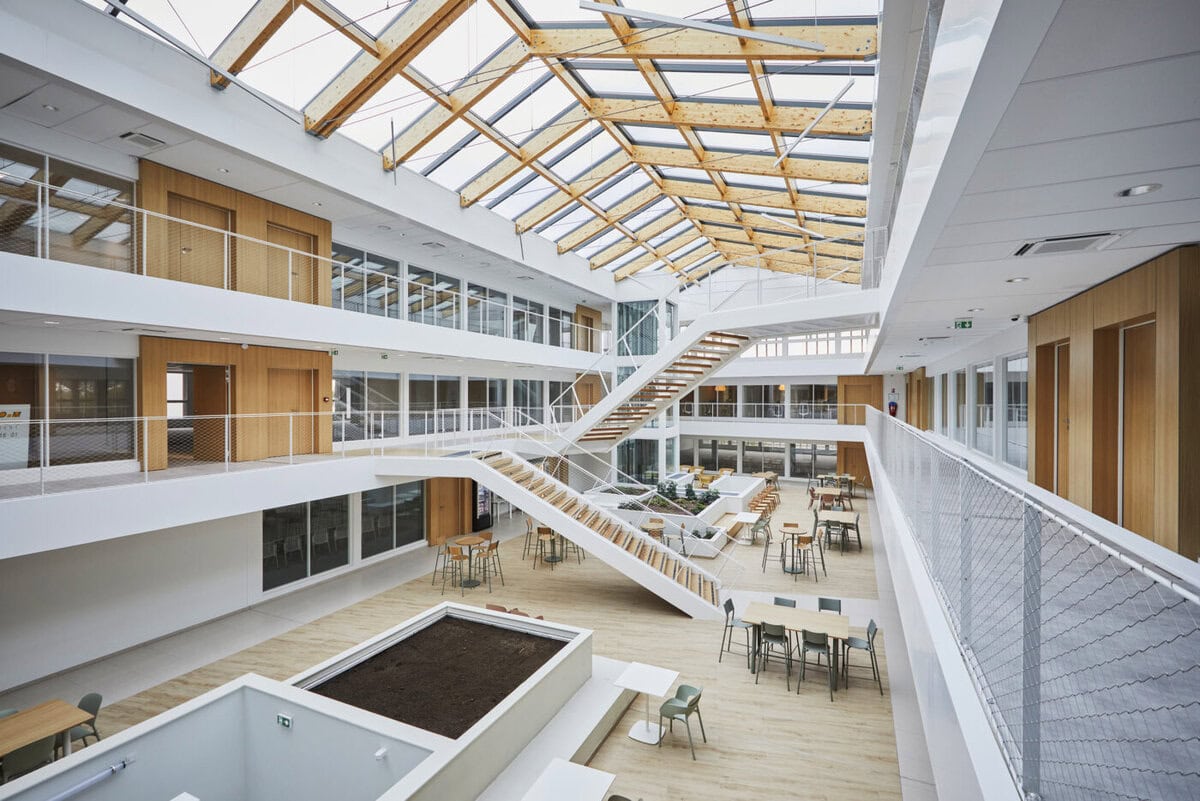 Die architektonische Gestaltung orientiert sich an der natürlichen Topografie des Areals und arbeitet mit gestreckten Linien und Faltungen, die das ursprüngliche Schulgebäude akzentuieren. Ein grosszügiges zentrales Atrium sorgt für reichlich Tageslicht in den angrenzenden Bürobereichen, während weitläufige Treppen und Wege eine ideale Erschliessung innerhalb des Gebäudes ermöglichen.