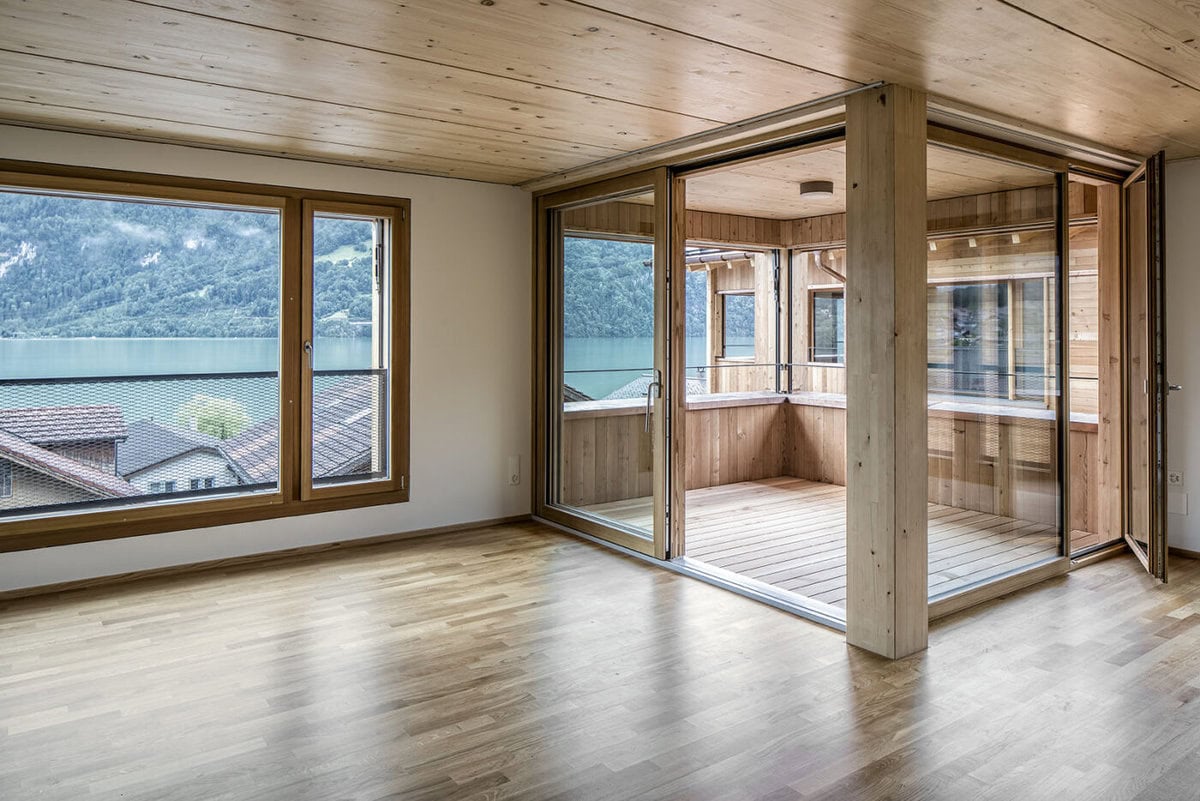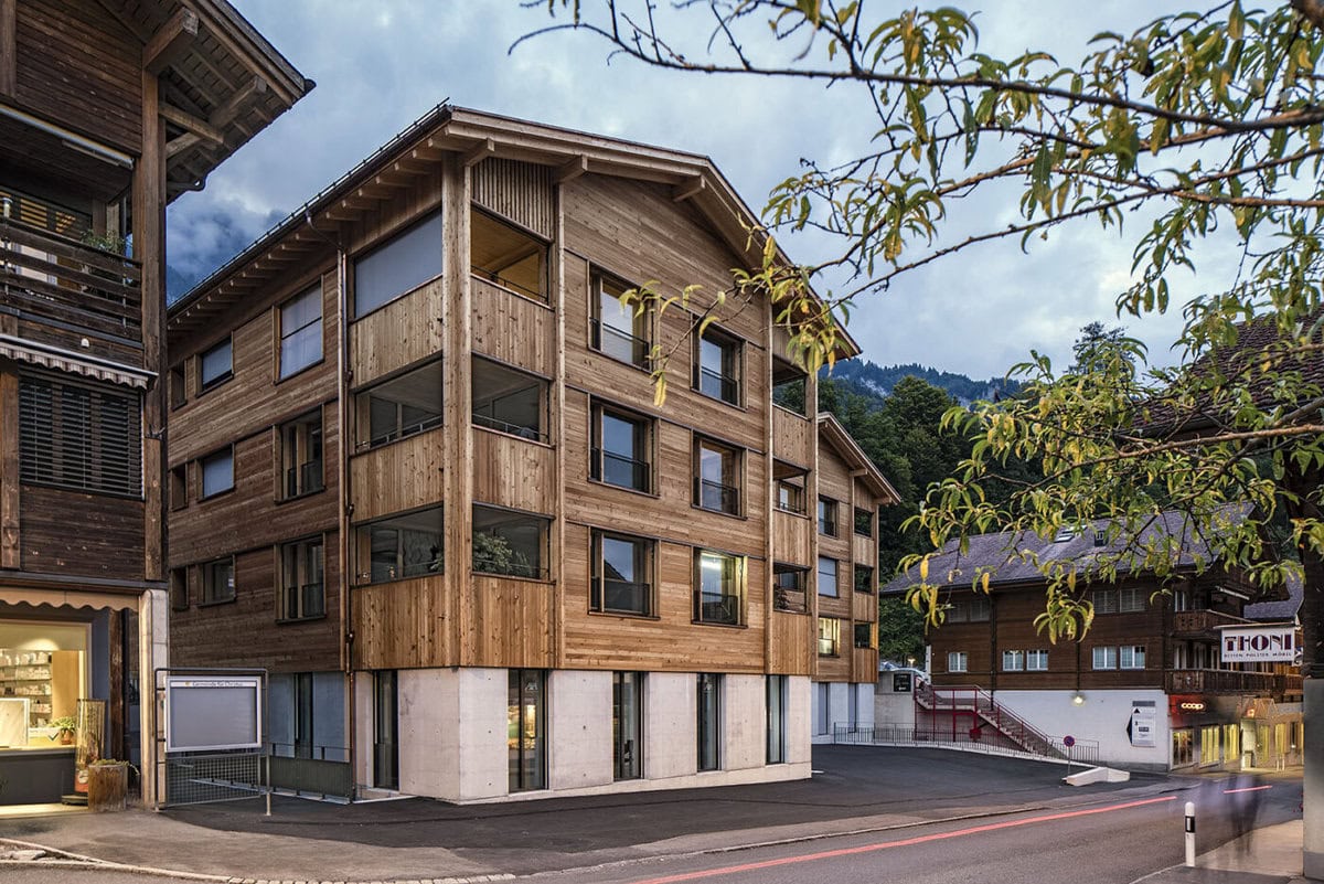 Als angepriesener «Ort wie aus dem Bilderbuch» – mit reich verzierten Holzchalets und insbesondere dem gletscherblauen See mit seinen Giessbachfällen – lockt Brienz jährlich eine Vielzahl von Touristen an. Das heimelige Dorf versetzt insbesondere rundum die Brunngasse im westlichen Zentrum Besuchende in Verzückung und ohne Weiteres in längst vergangene Zeiten. Der Dorfkern, der auf der einen Seite als Filmkulisse erscheint, ist auf der anderen Seite ein über lange Zeit, durch viele Generationen hindurch gewachsenes Gebilde voller Authentizität – und weitaus mehr als ein idyllischer Pfad aus Pflastersteinen, als ein von den Influencern eingeatmeter Hauch Freilichtmuseum. Verstärkt vermag sich diese Authentizität mit der Dynamik neuer Bauvorhaben auch ins östliche Brienz abzubilden. Mit den beiden vom Büro L2A Architekten aus Unterseen realisierten Wohnbauten wird die dortige gebaute Umgebung stilvoll ergänzt, womit das Malerische definitiv auch in diesem Gemeindegebiet erscheint. Das Ensemble reiht sich in die bestehende Zeile der die Strasse säumenden Holzchalets bestens ein und ist dennoch zeitgemäss – «ehrlich und konsistent materialisiert und gebaut – ohne irgendwelche Chalet-Klischees verwendet zu haben», betont der zuständige Architekt Paul Rosser.