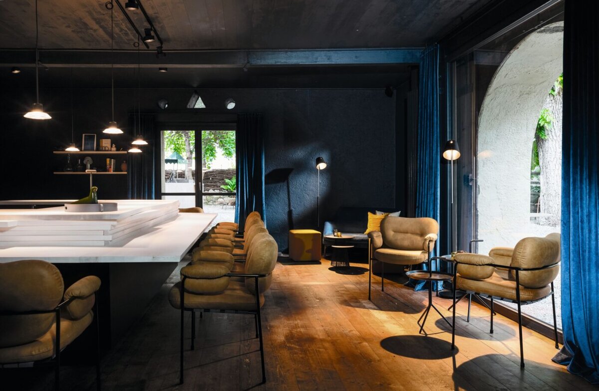 Carmen Gasser Derungs erklärt: «Im Oz, das Platz für maximal zwölf Personen bietet, sitzen die Gäste an einem langen Tresen, sehen dem Küchenteam bei der Arbeit zu und geniessen, was nach und nach vor ihren Augen entsteht.» Zu Beginn fanden sie eine ziemlich dunkle, kleine Remise, in direkter Nachbarschaft zum herrschaftlichen Schloss und als anspruchsvolle Aufgabe vor. «Wir wollten dennoch den Charakter des Lokals bewahren und haben mit lokalen Handwerkern und Materialien gearbeitet, mit bestehenden Holzdielen für den Boden, die Decke und den grossen Tresen, haben alle Wände in einem dunklen Blau gestrichen, welches sich schliesslich auch als genau richtig für die gereichten Speisen erweist. Unverzichtbare Einrichtungselemente sind die bequemen, nordisch inspirierten Sessel, schliesslich dauert die entspannte Menufolge mehrere Stunden», ergänzt Carmen Gasser Derungs.