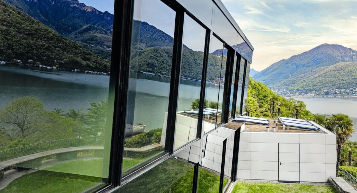 Oberhalb des Lago di Lugano wurde an einem steilen Südhang ein bemerkenswertes Ferienhaus fertiggestellt, das sich entschieden von der konventionellen Architektursprache der Region absetzt. Während die lokale Bautradition von geneigten Ziegeldächern, flachbogigen Arkaden, kleinteiligen Fensteröffnungen und verputzten Fassaden mit steinernen Applikationen geprägt ist, setzt der Neubau auf eine radikale Architektursprache: Ein monolithischer, vollständig verglaster Baukörper, der sich kompromisslos von jeglichem regionalistischen Duktus distanziert.