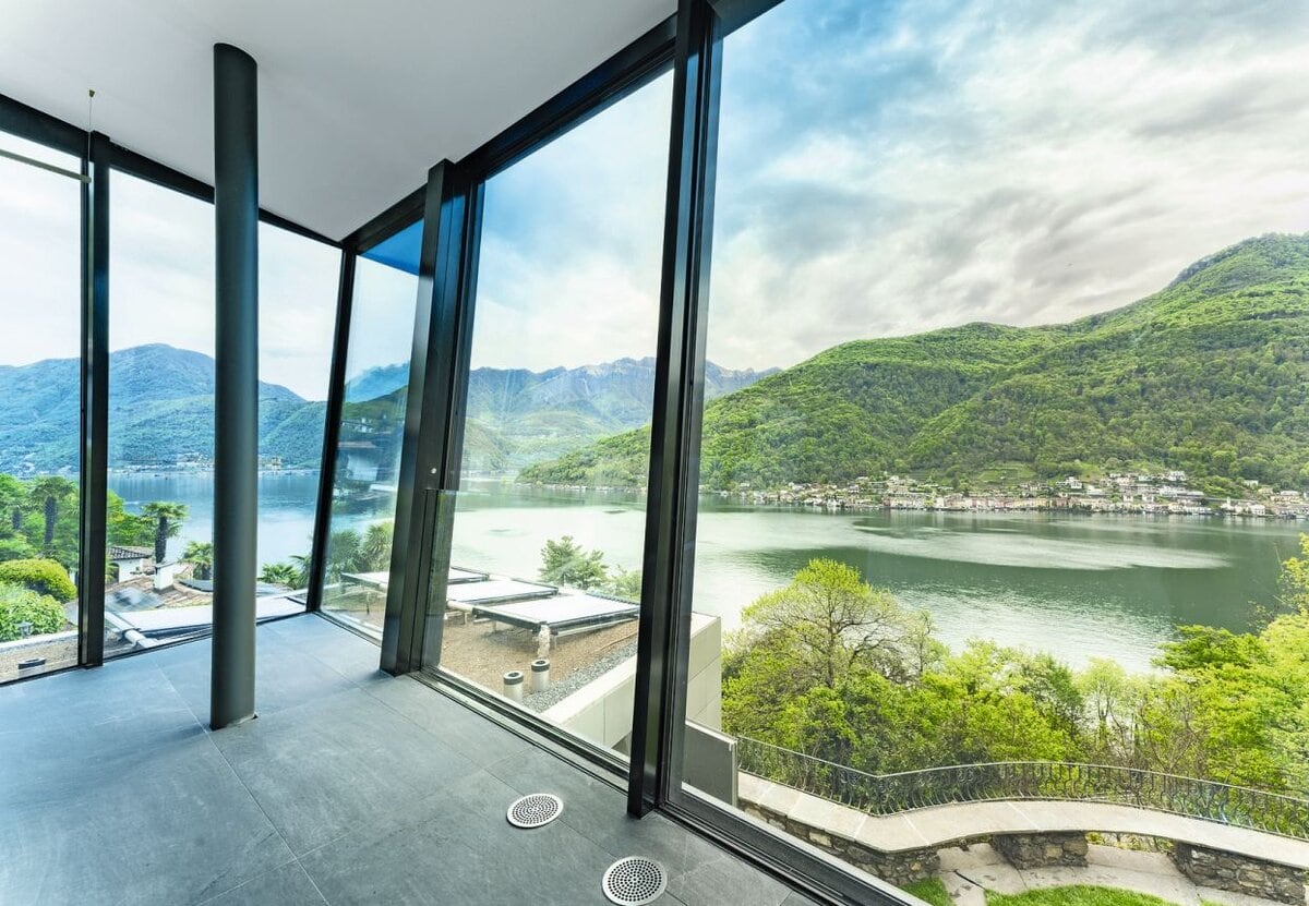 Mit einer schwarzen, kristallin anmutenden Villa entstand ein kompromissloses Architekturstatement in extremem Terrain. Die vollständig verglaste Fassade und die grossformatigen Schiebefronten von «air-lux» inszenieren das umliegende Panorama und verbinden Innen- und Aussenraum zu einer durchkomponierten Einheit.