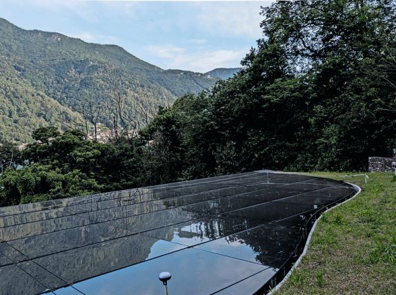 Das Architekturbüro Deltazero mit Sitz in Lugano-Paradiso hat ein «Stealth-Gebäude» entworfen, das sich durch minimale visuelle Präsenz in die Topografie integriert. «Durch die Präsentation eines Modells und Proben von dunkel getöntem, halb-reflektierendem Glas für die Fassaden sowie von vollständig schwarzen, glänzenden Photovoltaikmodulen für die Dachflächen, konnten die Verwaltungsbehörden auf allen Ebenen von der Kohärenz und Umsetzbarkeit des architektonischen Vorschlags überzeugt werden», erklärt Stefano de Angelis vom Architekturbüro Deltazero. Das Ergebnis dieser radikalen Entwurfshaltung ist ein Ferienhaus, das sich als nahezu schwarzer Kristallkörper in die Hanglage einfügt. Die dunklen, teils spiegelnden Glasflächen reflektieren Licht, Vegetation und Topografie.