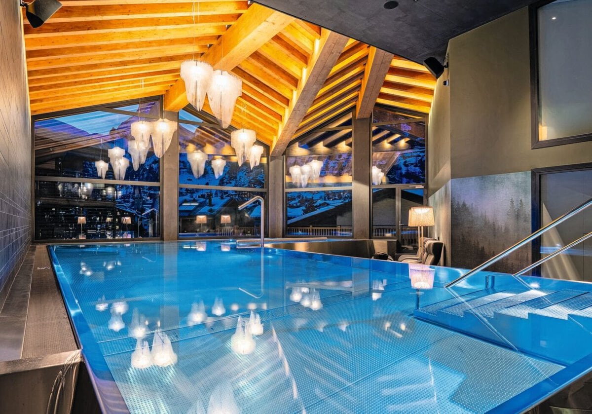 Der grosszügige Spa-Bereich entstand in Zusammenarbeit mit Klafs. Mit 550 Quadratmetern zählt er zu den grösseren in Zermatt. Sabine Pulfer, Innenarchitektin bei Klafs, entwarf gemeinsam mit Fachberater Philipp Cipri ein Designkonzept, das auf Naturmaterialien und warme Farbtöne setzt und somit wunderbar zum Rest des Hauses passt. Die durchdachte Raumgestaltung schafft ein Ambiente, das modernen Wellnessansprüchen gerecht wird und gleichzeitig die familiäre Atmosphäre des Hauses widerspiegelt.