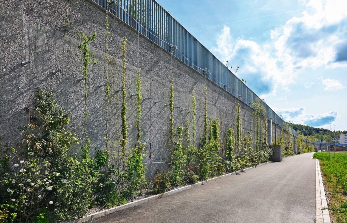 Über die A1 bei Zürich Schwamendingen fahren täglich mehr als 120 000 Fahrzeuge. Um Lärm und Feinstaub zu reduzieren, wurde die Autobahn auf einer Länge von 950 Metern eingehaust. Auf dem Dach entsteht ein Park und an den Wänden wachsen Kletterpflanzen an Rankstrukturen von Jakob Rope Systems heran.