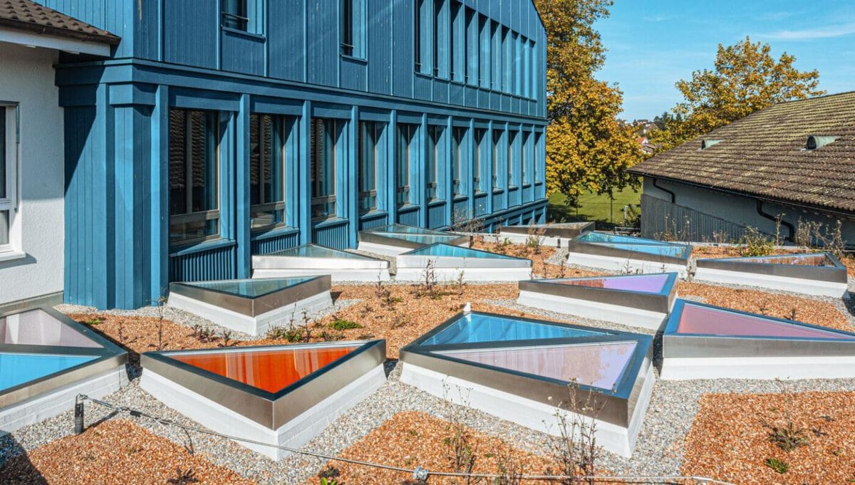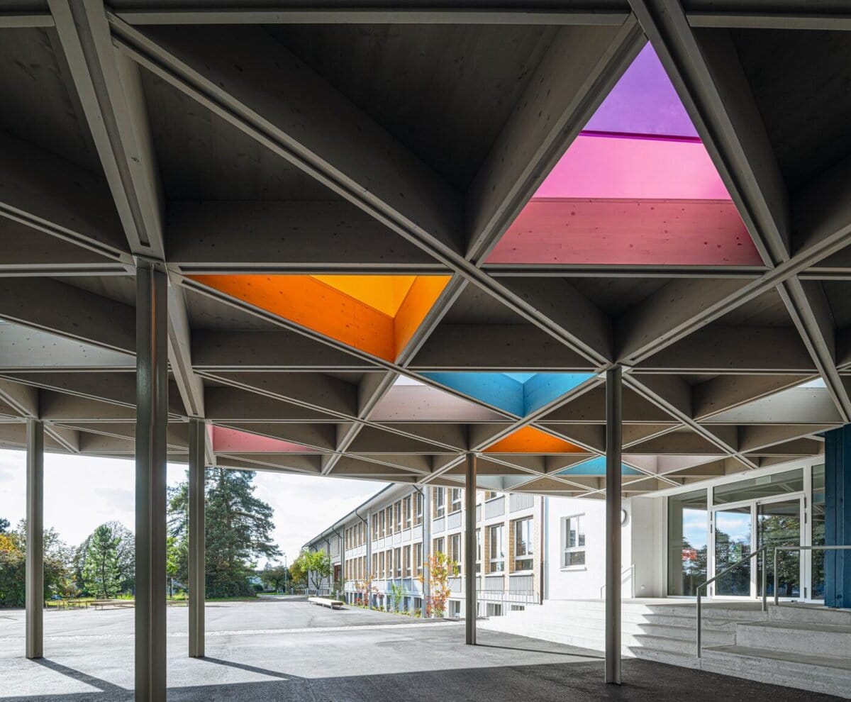 Zwischen dem 1954 erstellten Altbau und dem 2025 fertiggestellten Neubau verbindet ein Tageslicht-Pavillon mehr als nur Räume, er verbindet Zeiten. Unter ihm leuchten 20 farbige Dreiecke in Orange, Hellblau, Pink, Lila und Grün wie Edelsteine in einer Dachlandschaft. Täglich durchqueren Lernende diese Passage. Doch sie gehen nicht einfach hindurch – sie erleben etwas. Unter einem Regenbogen aus Glas wandern sie von gestern nach morgen. Ein stiller Erlebnispark aus Tageslicht und Farbe entsteht.